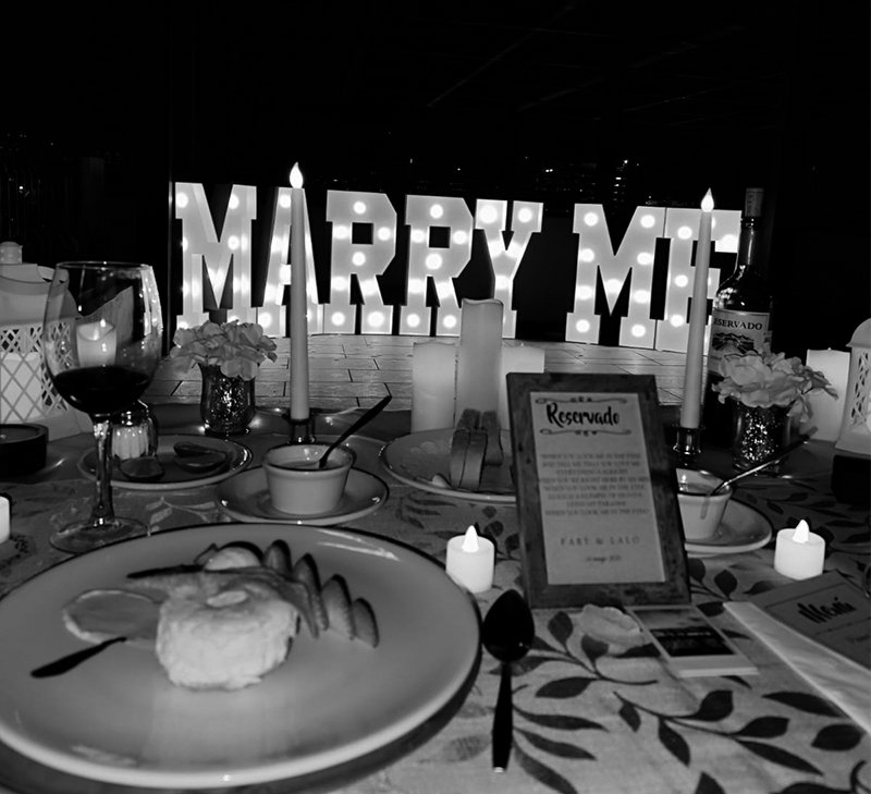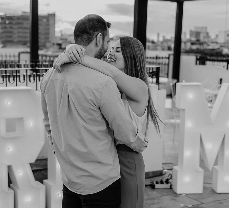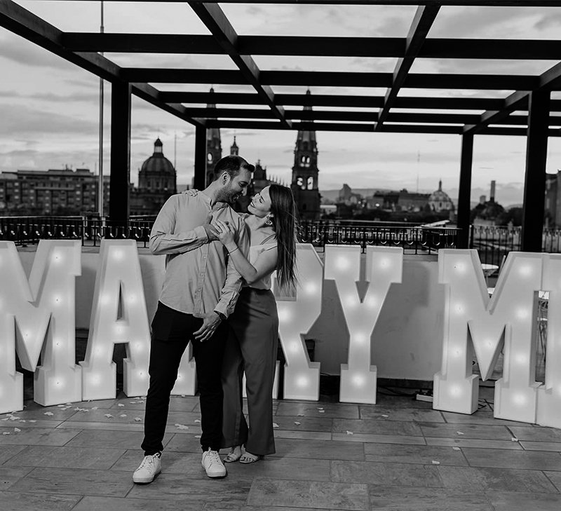 Él lo planeó todo con la complicidad de sus amigos. La excusa perfecta: un viaje a Guadalajara para celebrar un cumpleaños. Justo a las 7:00 pm, antes de salir hacia la 'fiesta', me invitó a subir a la terraza para ver la vista. Lo que encontré allí me dejó sin aliento: una cena privada bajo el cielo y unas letras gigantes que formaban la pregunta más importante de nuestras vidas: '¿Te casas conmigo?'. En ese instante, rodeados de la belleza de Guadalajara y con el corazón a punto de estallar, el viaje se transformó en el escenario de nuestra próxima gran aventura.